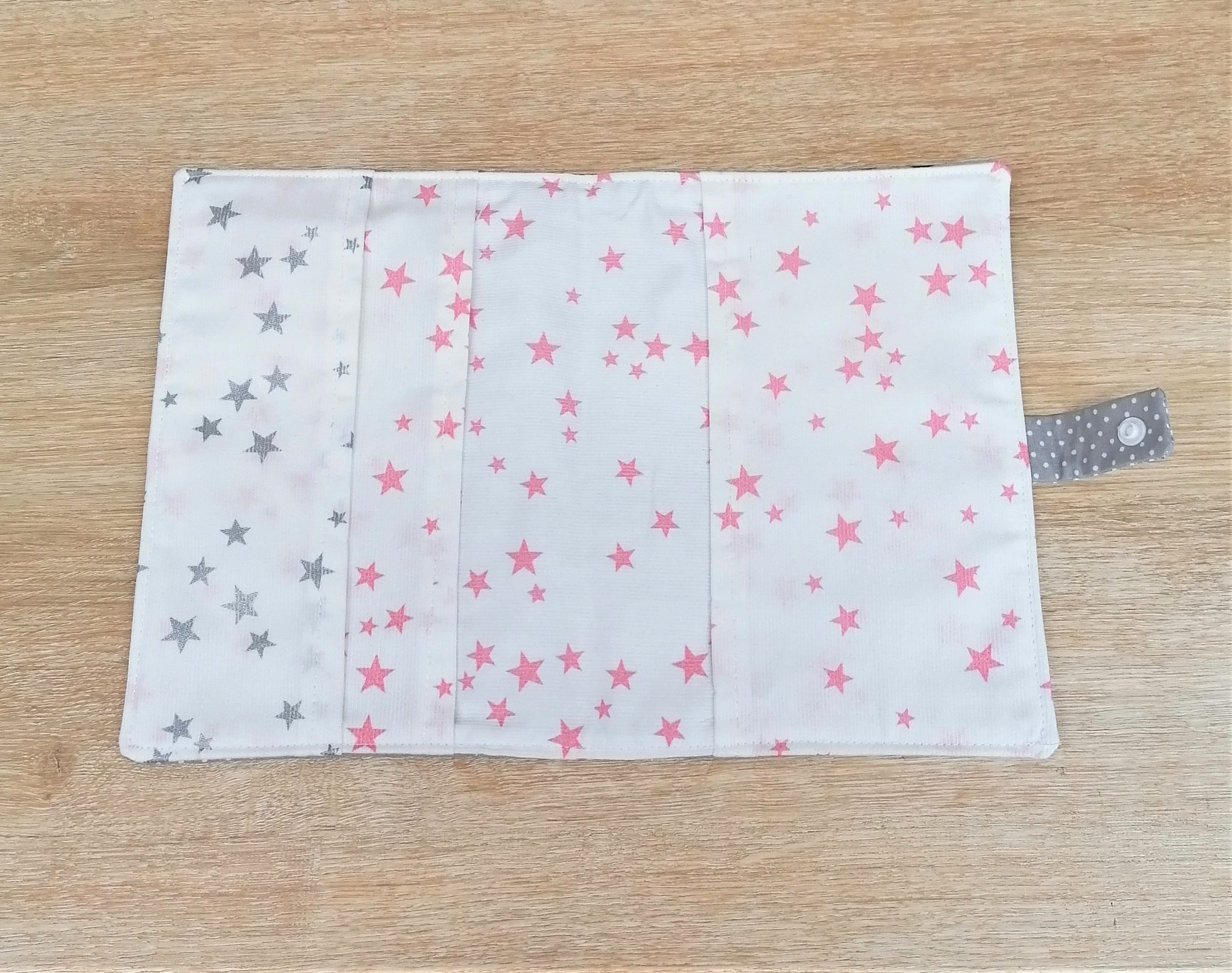 Ce protège carnet de santé est un cadeau parfait pour une naissance. Il est fait de coton et est entièrement doublé. Un rabat interieur permet de ranger les ordonnances et autres papiers importants. Il se ferme grace à un bouton pression et permet de ne rien perdre.
