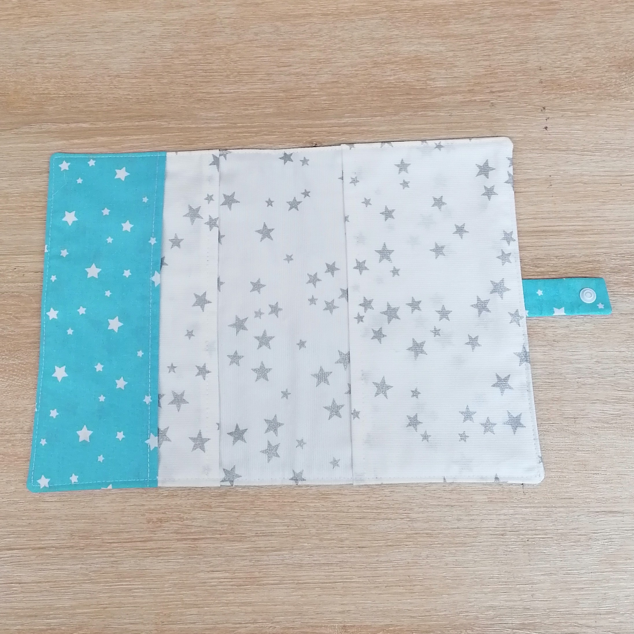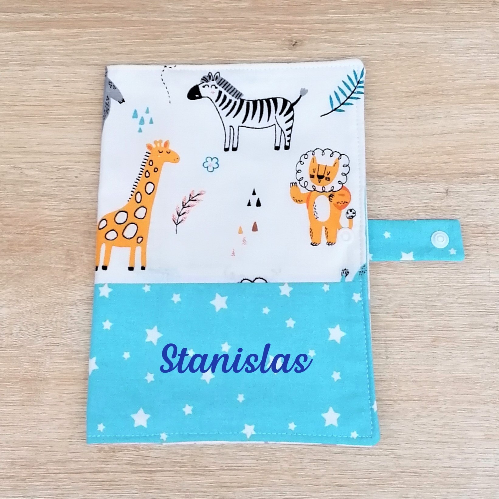 Ce protège carnet de santé est un cadeau parfait pour une naissance. Il est fait de coton et est entièrement doublé. Un rabat interieur permet de ranger les ordonnances et autres papiers importants. Il se ferme grace à un bouton pression et permet de ne rien perdre.