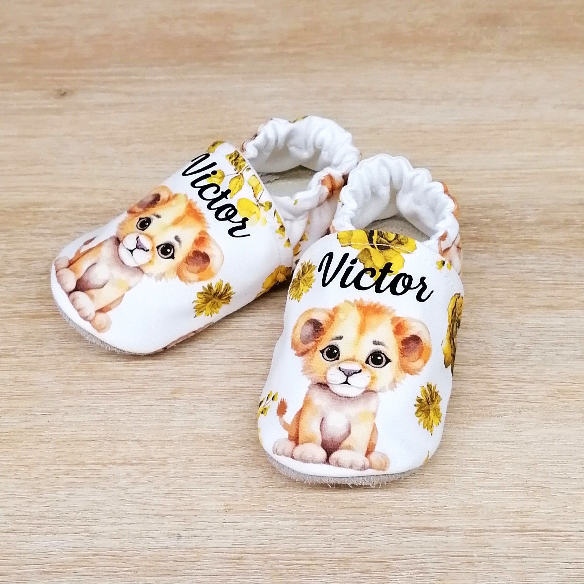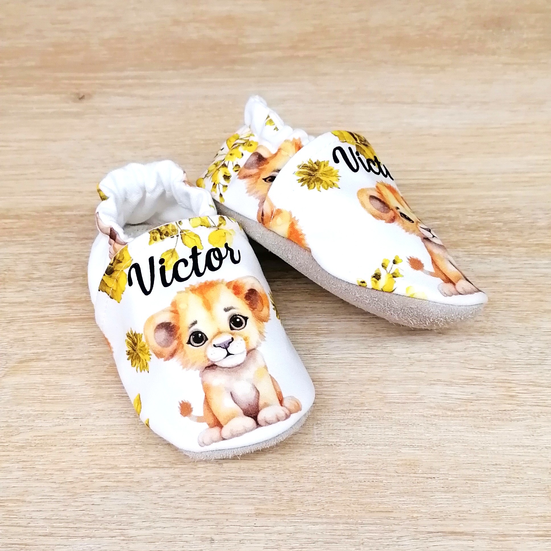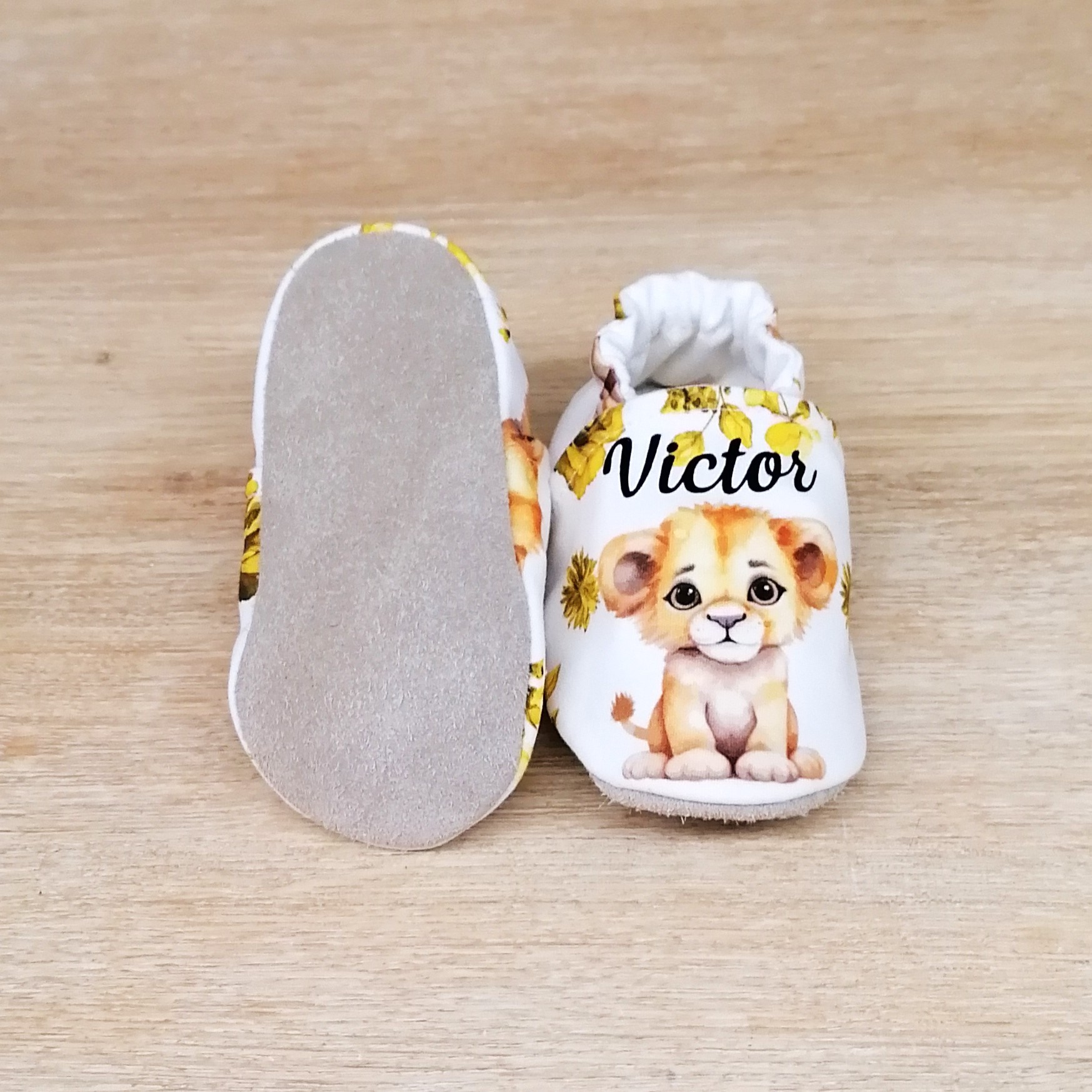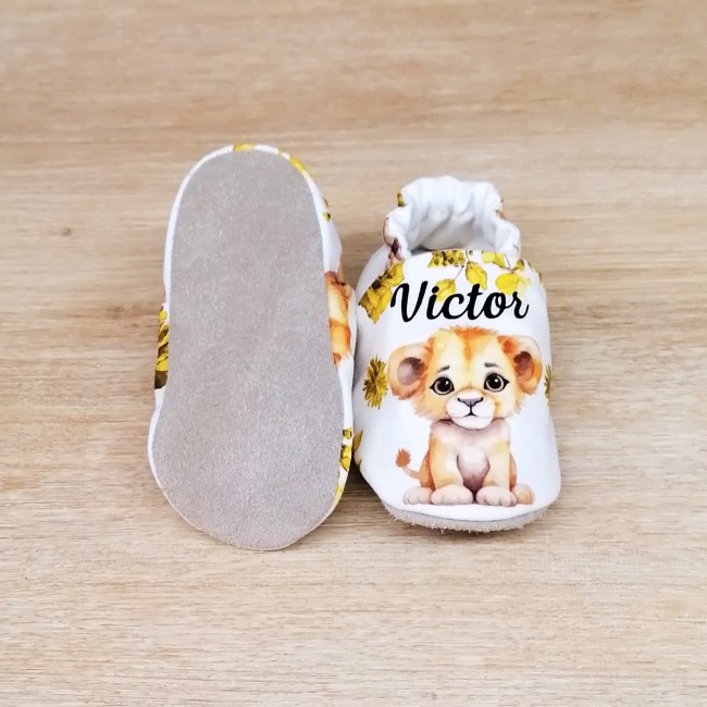 Chaussons personnalisables pour bébé en coton avec lion. La semelle est en cuir véritable antidérapante. Les chaussons sont entièrement doublés de coton ou de polaire, pour un meilleur confort.