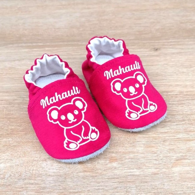 Chaussons bébé personnalisables semelle cuir et velours rose avec koalas